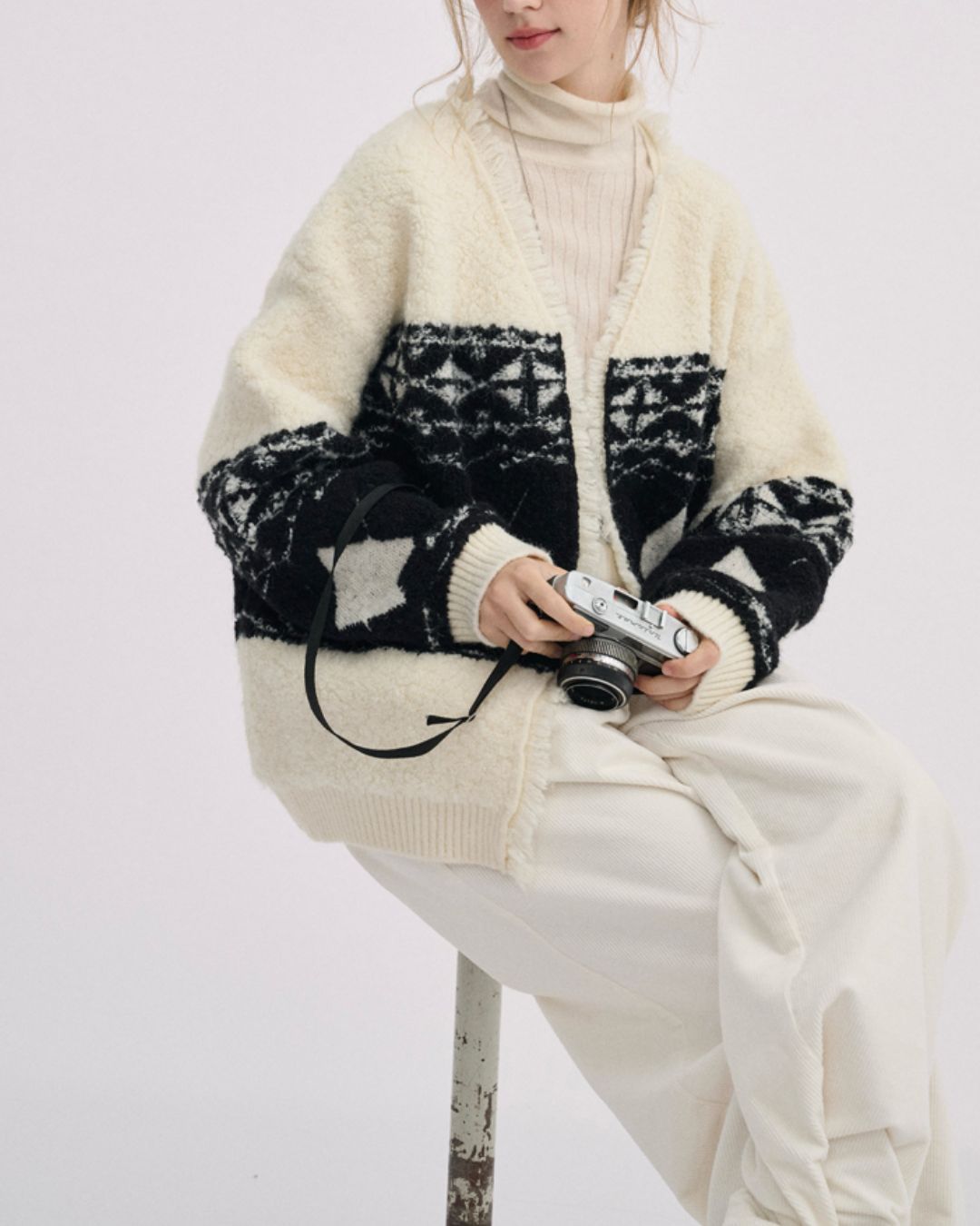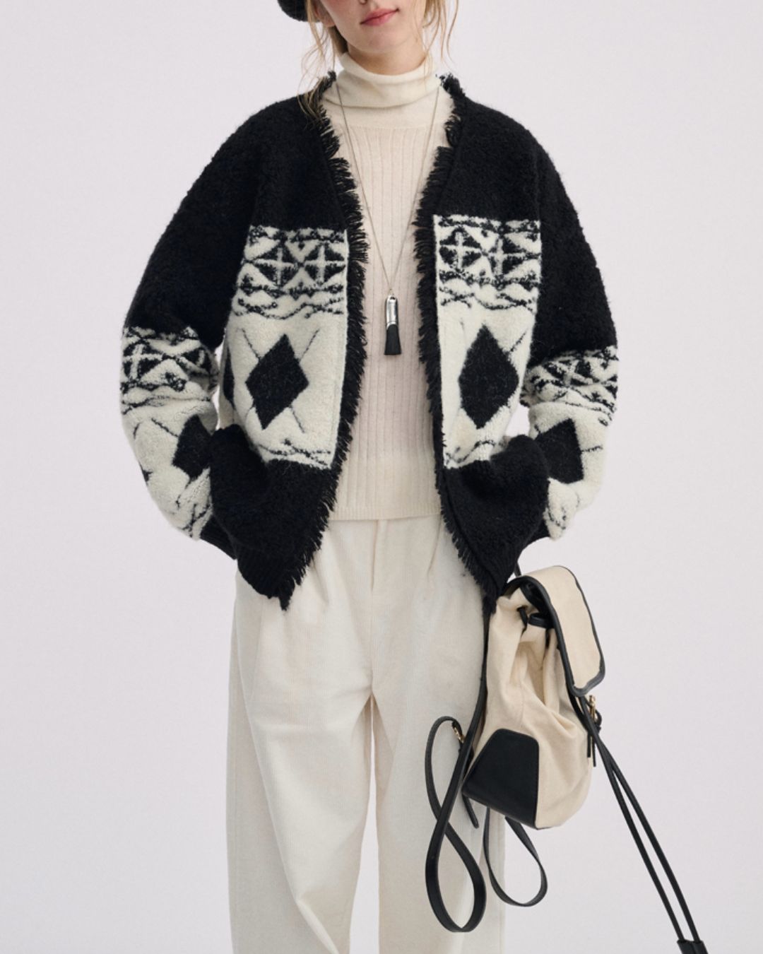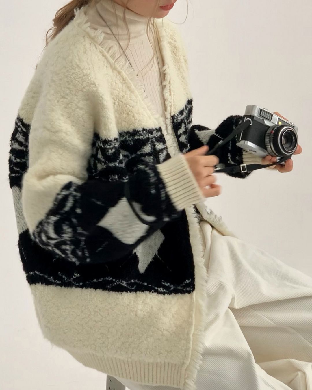 V-neck Geometric Raw Edge Knit Cardigan KN076