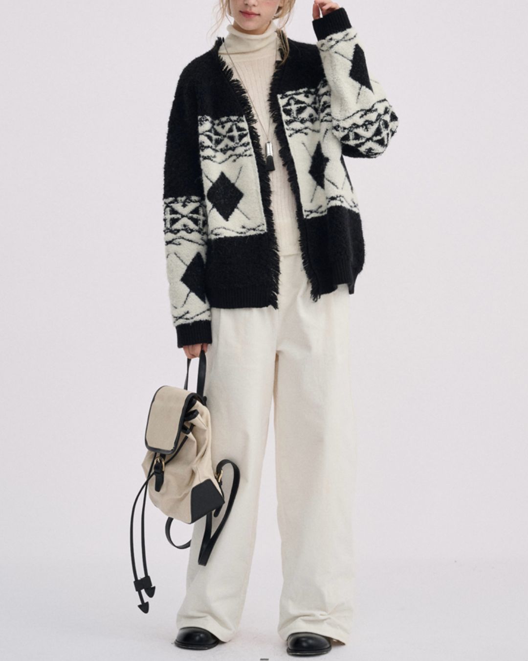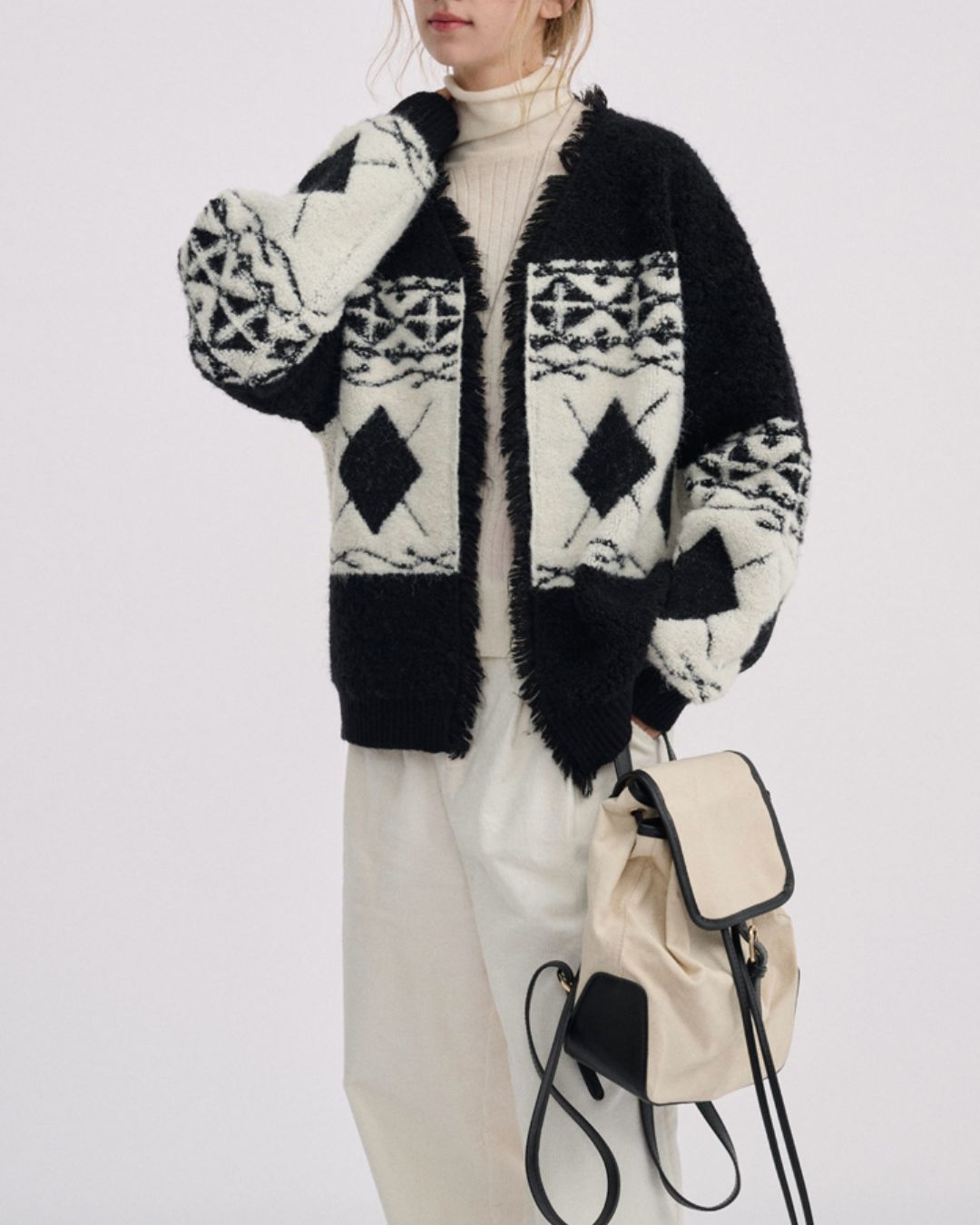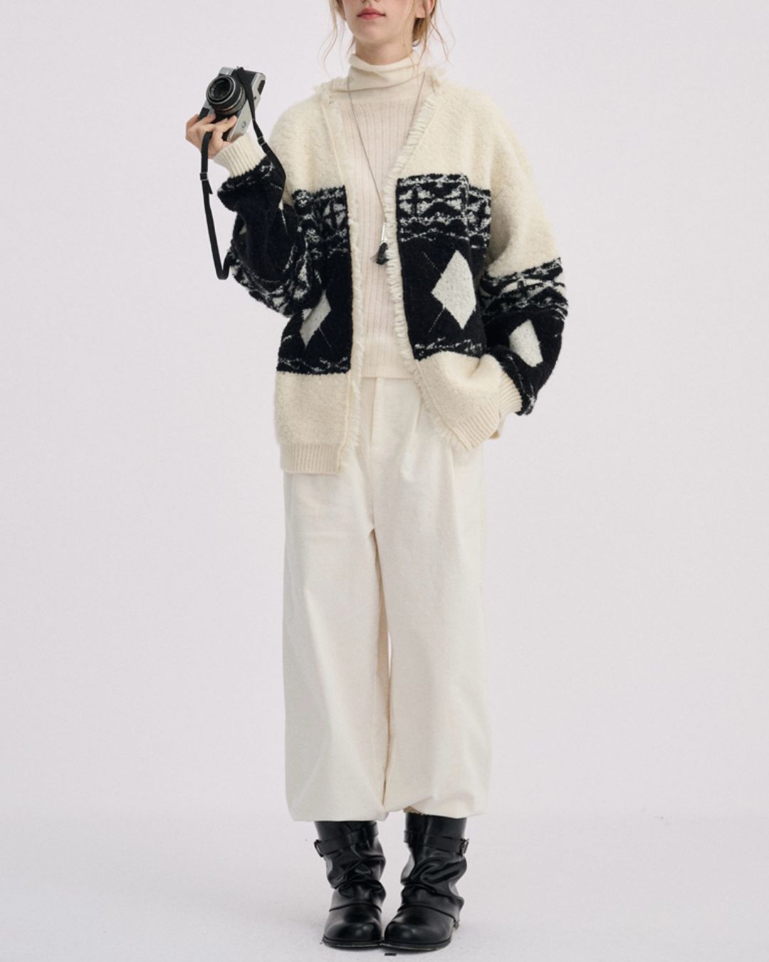 V-neck Geometric Raw Edge Knit Cardigan KN076